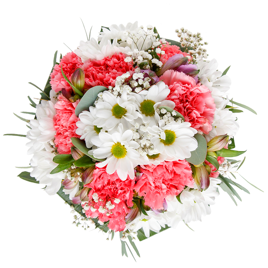 Express your feelings with our romantic and unique flower arrangement. This captivating bouquet features snow-white chrysanthemums, soft gypsophila, and light pink carnations, elegantly wrapped with rich aspidistra leaves.